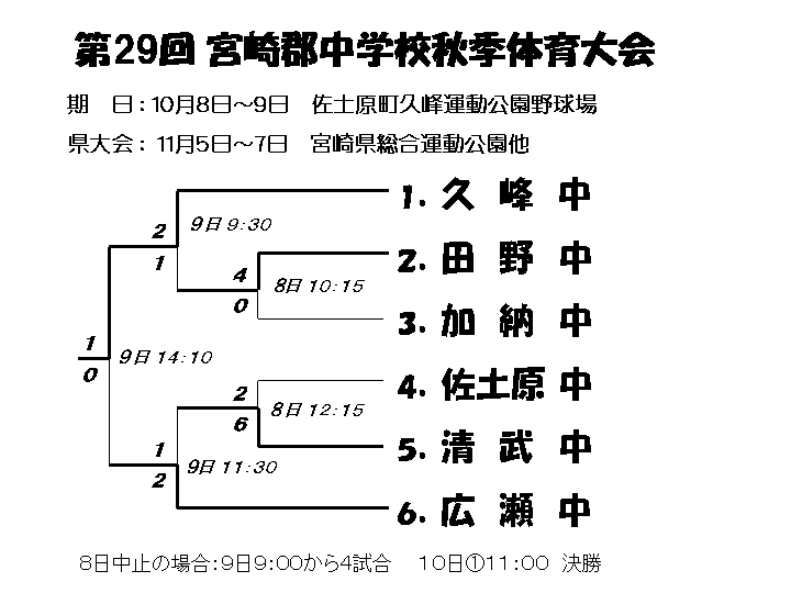 ◆1回戦(10月8日) 田 野 2000020|4 加 納 0000000|0 佐土原 0000011|2 清 武 302001X|6 ◆準決勝(10月9日) 田 野 0001000|1 久 峰 0000002|2 広 瀬 0000020|2 清 武 1000000|1 ◆決 勝(10月9日) 広 瀬 0000000|0 久 峰 100000X|1