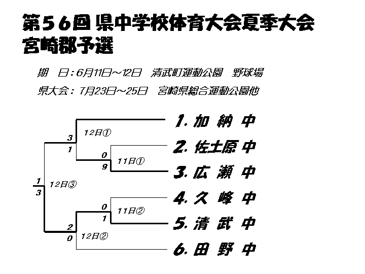 ◆1回戦 (11日 清武町運動公園 野球場) 佐土原 00000|0 清 武 0100000|1 広 瀬 0315X|9 久 峰 0000000|0 ◆準決勝 (12日 清武町運動公園 野球場) 加 納 0000030|3 田 野 0000000|0 広 瀬 0001000|1 清 武 0200000|2 ◆決 勝 (12日 清武町運動公園 野球場) 加 武 0100000|1 清 武 200001X|3