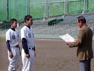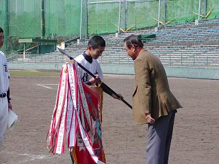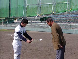 福元副会長から住吉中に優勝賞状、優勝旗授与 大塚に準優勝賞状授与