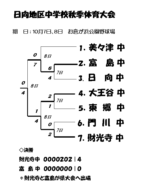◇1回戦(10月7日) 日 向 0000121|4 大王谷 0010010|2 富 島 020211X|6 東 郷 0000010|1 門 川 0000000|0 財光寺 000002X|2 ◇準決勝(10月8日) 富 島 13120|7 大王谷 0010000|1 美々津 00000|0 財光寺 100030X|4