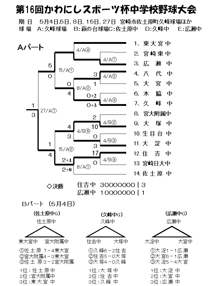 ◆準決勝(5/15 久峰球場) 広 瀬 1100120|5 住 吉 000031|4 久 峰 0000000|0 大 塚 000010|1