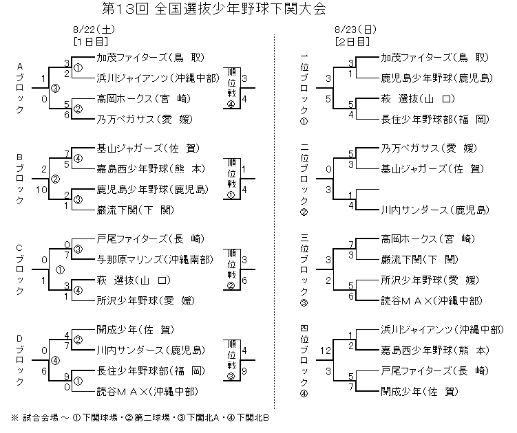 1、日 時 平成21年8月22日(土)〜23日(日) 2、場 所 山口県下関市 3、参 加 者 中国、四国、九州から16チーム 4、組合わせ