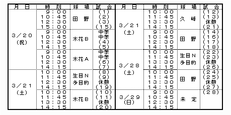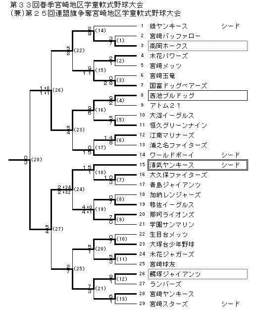 ◆1回戦(3/20) 高岡ホークス 1021030│7 木花パワーズ 0000020│2 宮崎バッファロー 0030000│3 宮崎メッツ 0000010│1 国富ドッグベアーズ 31267│28 アトム21 000002│2 宮崎玉竜 0000│0 西池ブルドッグ 310203x│9 恒久グリーンナイン 2000032│7 浦之名ファイターズ 206000│8 大淀イーグルス 0300200│5 江南マリナーズ 00068×│14 青島ジャイアンツ 10002│3 大久保ファイターズ 3133×│10 ・1回戦(3/21) 加納レンジャーズ 00000│0 学園サンマリン 00000│0 穆佐イーグルス 10222x│7 那珂ライオンズ 41011x│7 大塚台少年野球 021031│7 木花ジャガーズ 040010│5 生目台メッツ 000000│0 宮崎球友 000030│3 鰐塚ジャイアンツ 00504│9 宮崎スターズ 1000000│1 ランバーズ 00100│1 宮崎ヤンキース 202011×│6 ◆2回戦(3/20) 木花パワーズ 002322│9 国富ドッグベアーズ 16400×│11 ・2回戦(3/21) 高岡ホークス 20214│9 恒久グリーンナイン 3000121│7 綾ヤンキース 20000│2 西池ブルドッグ 121311×│9 ワールドボーイ 18042│15 清武ヤンキース 21732│15 江南マリナーズ 00000│0 大久保ファイターズ 00100│1 判 穆佐イーグルス 0211000│40 木花ジャガーズ 0001000│1 那珂ライオンズ 0100300│41x 大塚台少年野球 000131×│5 鰐塚ジャイアンツ 1310200│7 宮崎ヤンキース 0120000│3 ◆3回戦(3/28) 国富ドッグベアーズ 0000011│2 ワールドボーイ 1000111│4 高岡ホークス 112010×│5 西池ブルドッグ 000104×│5 判定 清武ヤンキース 0200000│234 鰐塚ジャイアンツ 200140│7 那珂ライオンズ 0000020│232 大塚台少年野球 200000│2 ◆準決勝(3/28) 判 西池ブルドッグ 0000010│11 鰐塚ジャイアンツ 3000010│4 高岡ホークス 0000001│10 清武ヤンキース 1010201x│5 ◆決 勝(3/29) 西池ブルドッグ 0000000│0 清武ヤンキース 000012×│3