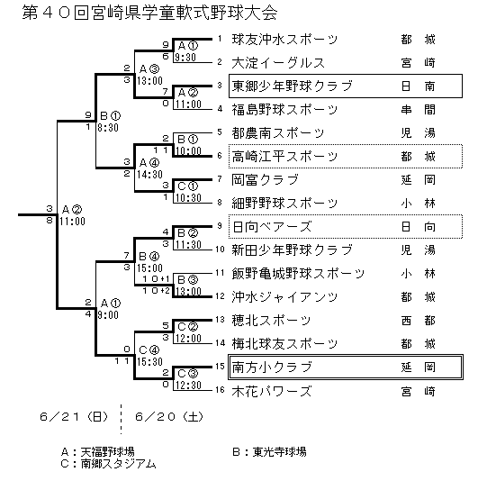 1、日 時 平成21年6月20日(土)、21日(日) 2、場 所 日南市天福野球場、東光寺球場、南郷スタジアム 3、参 加 者 宮崎県内9支部の学童16チーム 4、上位大会 ・1、2位:第7回王貞治杯九州学童軟式野球大会(11月21日〜23日 宮崎市)に出場 ・3位(2):第22回九州地区学童軟式野球大会(8月22日〜23日 沖縄県)に出場 5、組合わせ